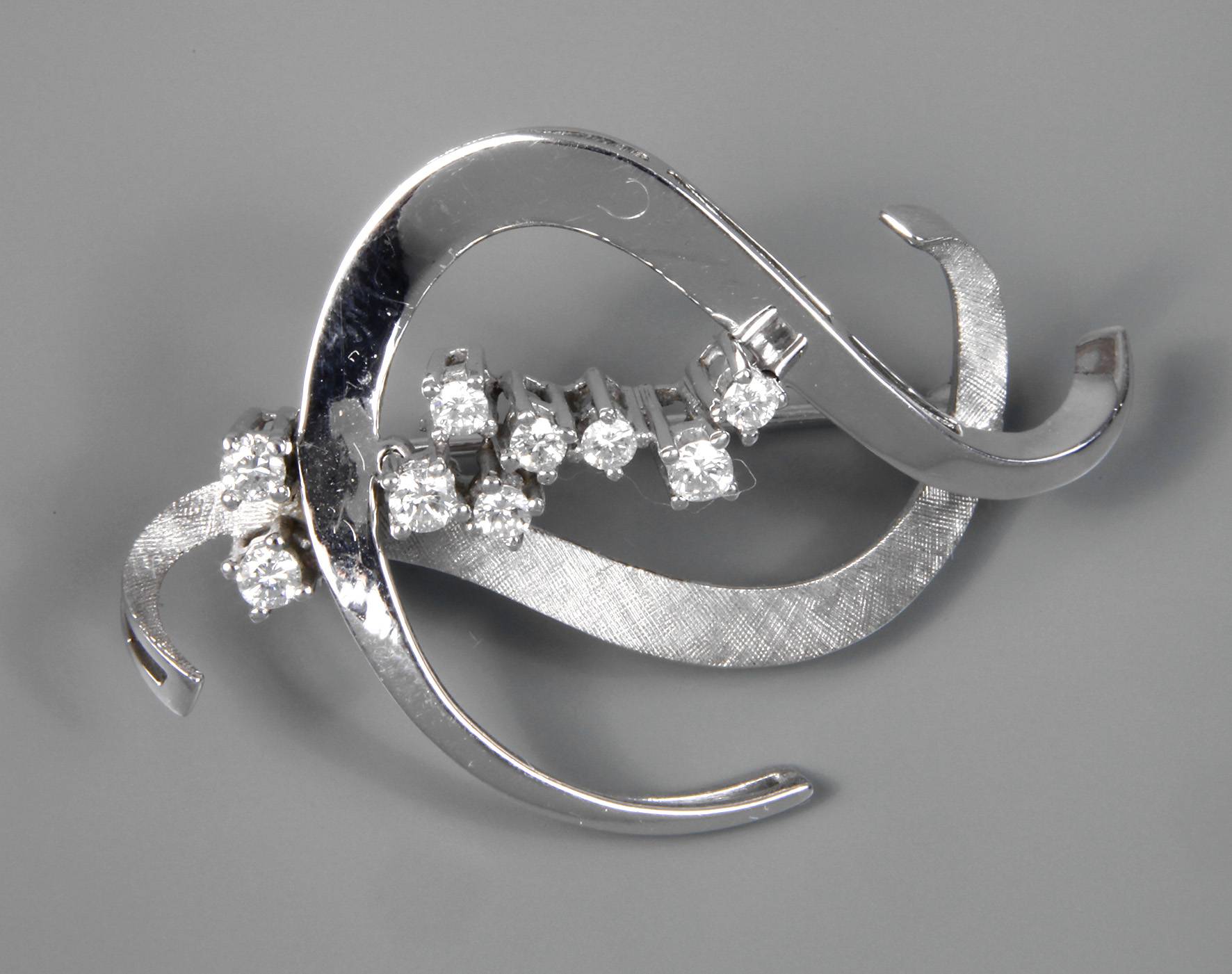 um 1980, Weißgold gestempelt 585 und Schriftzug Roxy, in Form stark stilisierter geschwungener Bänder mit polierter und fein ziselierter Oberfläche, besetzt mit neun Brillanten in Krappenfassung von zusammen ca. 0,45 ct in sehr guter Qualität, minimalste Tragespuren, Maße ca. 29 x 42 mm, G ca. 6,9 g.