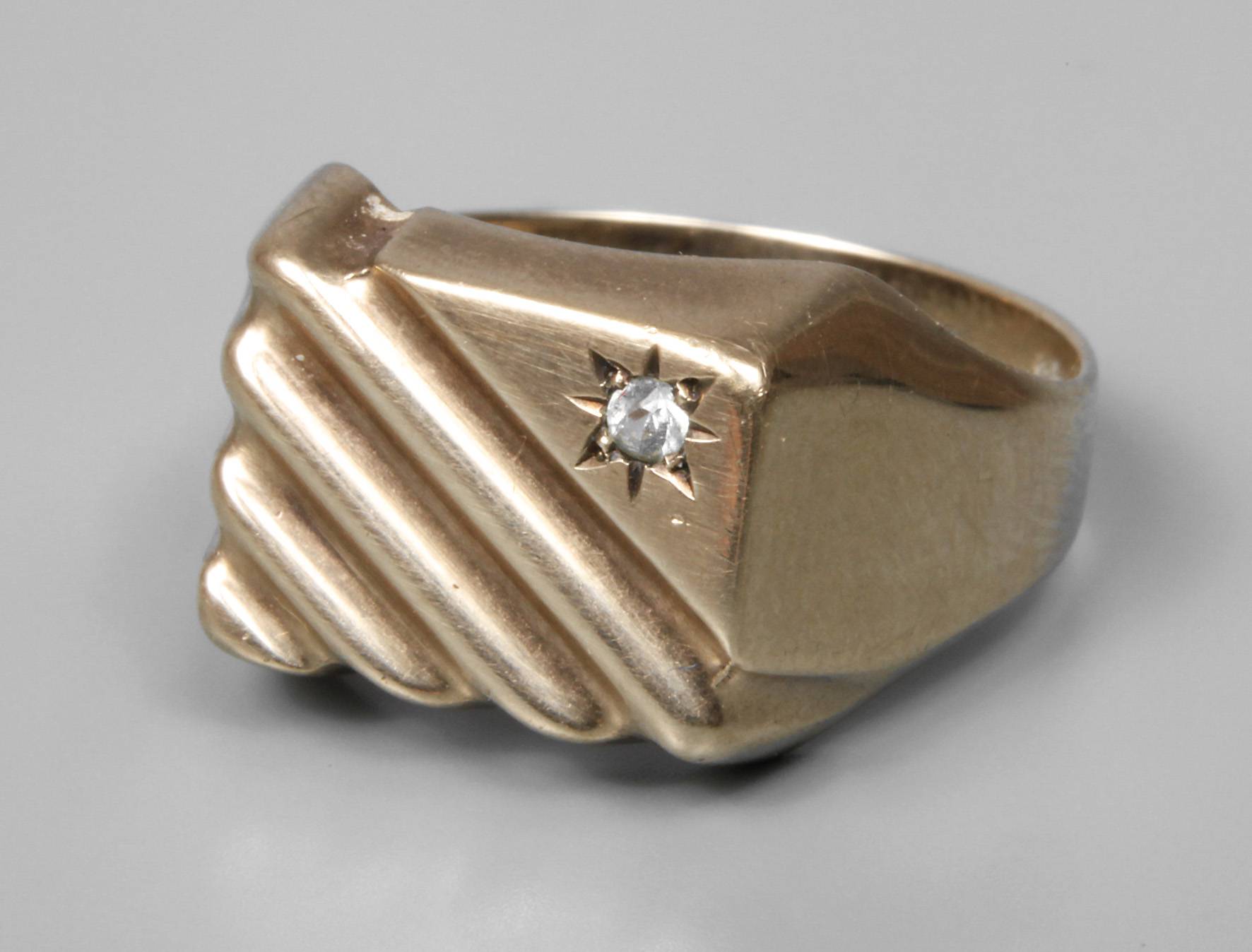 Ende 20. Jh., Gelbgold gestempelt 333, sich zum ca. 13 mm hohen Ringkopf verbreiternde Schiene, besetzt mit einem synthetischen Zirkonia, leichte Tragespuren, RW 20 mm, G ca. 4,7 g.