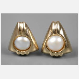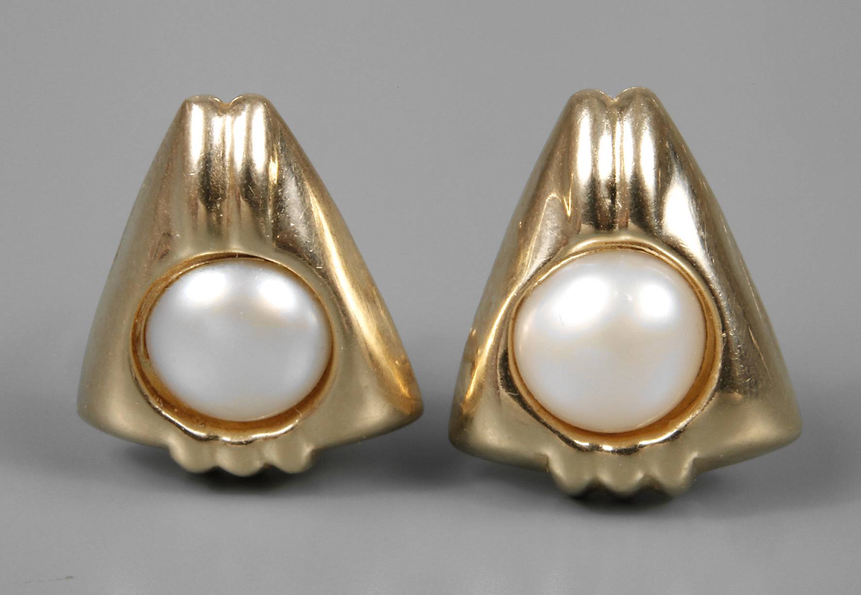 um 2000, Gelbgold gestempelt 585, besetzt mit je einer Halbperle, Maße ca. 17 x 15 mm, G gesamt ca. 3,4 g.