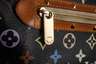 Ende 20. Jh., gemarkt sowie geprägte Seriennummer FL0034, Bowlingbag aus schwarzem Rindsleder mit gedrucktem typischen Dekor, abgesteppte Zierteile aus cognacfarbenem Glattleder, vergoldete Ziernieten und Metallteile aus Messing, Innenleben in taupefarbenem Veloursleder ausgekleidet, stärkere Alters- und Gebrauchsspuren, rückseitig mit kleiner Fehlstelle, L 35 cm.