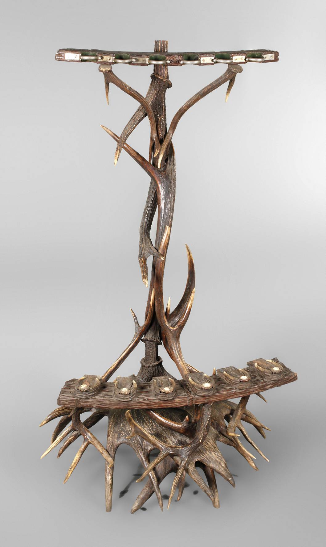 um 1880, gefertigt aus zwei kapitalen Elchschaufeln und verschraubten Hirschgeweihen, Halterungen für sechs Gewehre mit klappbaren Metallhaken, oberer Abschluss fehlt sonst gut erhalten, H 136 x B 81 x T 65 cm.