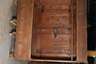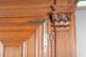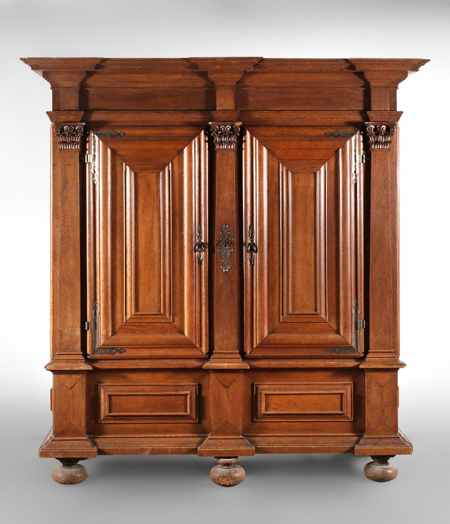 1. Hälfte 18. Jh., Eiche massiv, komplett zerlegbarer, zweitüriger Schrank mit feststehender Schlagleiste, Front mit drei Lisenen und reich geschnitzten korinthischen Kapitellen, darüber hohes, weit ausladendes Profilgesims, schöne handgeschmiedete Eisenbeschläge, originale Kugelfüße (diese mit altem Wurmbefall), Kassettenfüllung auf der rechten Seite mit Trocknungsriss und kleiner Fehlstelle, Rückwand fehlt, H 227 x B 209 x T 63 cm.