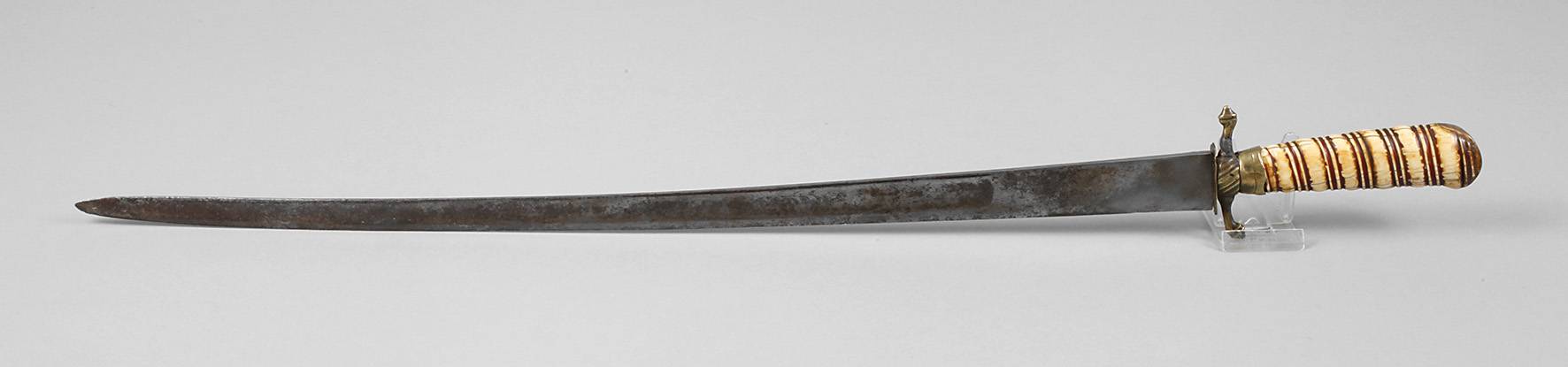 18. Jh., Elfenbeingriff mit Messingmontur, leicht gekrümmte Klinge mit beidseitiger Kehle, leichte Narbung verputzt, Z II-III, L ca. 70 cm.