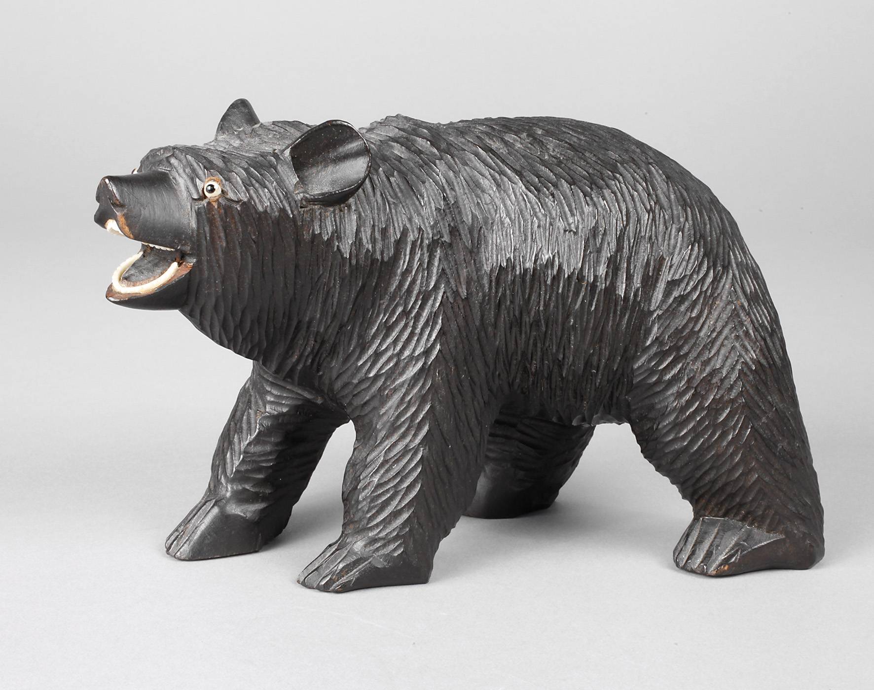 um 1930, Hartholz geschnitzt und geschwärzt, mit eingesetzten Partien aus Glas bzw. Bein, vollplastische Darstellung eines mächtigen Bären mit weit aufgerissenem Maul, H 12,5 cm.