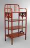 wohl Wien, um 1900, am Boden gemarkt mit altem Klebeetikett ”Thonet”, Buche massiv, rotbraun gebeizt, stabiles Regal aus Bugholz mit verschraubten Böden, seitlich floral verziert, unfertig restauriert, H 114 x B 63 x T 35 cm.