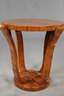 Nussbaummaser furniert, 1930er Jahre, runde Platte getragen von vier s-förmig geschwungenen, leicht überstehenden Beinen, auf rundem Sockel montiert, Furnierfehlstellen, restaurierungsbedürftig, H 65 cm, D 60 cm.