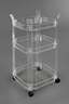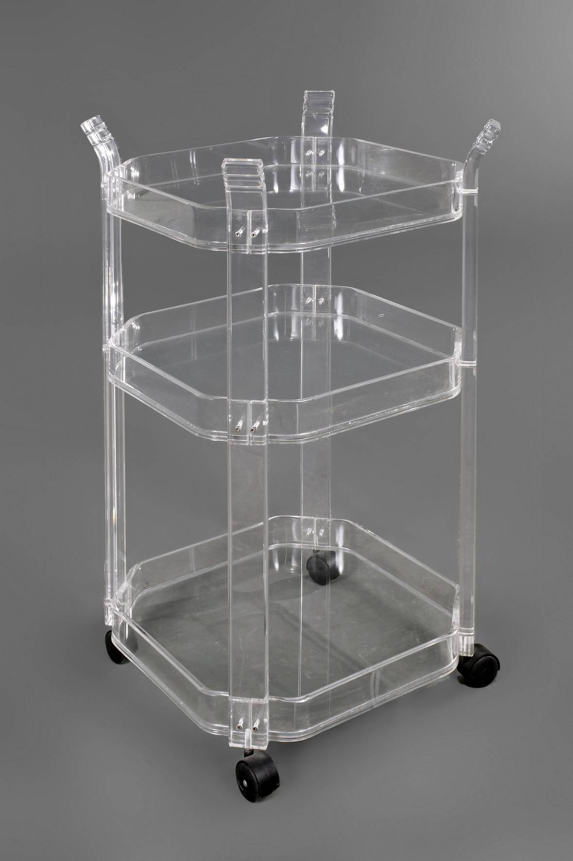 Plexiglas, 1980er Jahre, quadratische Grundfläche mit abgeschrägten Ecken, drei Etagen, auf Rollen, sehr guter Zustand, Maße 86 x 45 x 45 cm.