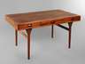 Entwurf Nanna Ditzel 1955 für Søren Willadsen Møbelfabrik Dänemark, Ausführung 1950er Jahre, palisanderfurniert, teilweise massiv, rechteckige Schreibplatte mit drei Schubkästen, auf schlanken, y-förmigen Beinen, frei im Raum stellbar, sehr guter unrestaurierter Originalzustand, H 73 x B 144 x T 74 cm.