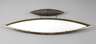 1980er Jahre, schwerer spitzovaler Schirm aus Bronzeguss, mit originalem Milchglasschirm, Halogenniedervoltleuchtmittel, mit Deckentransformator, an Drahtseilen abgehängt, Funktion nicht geprüft, Schirm an der Oberseite etwas fleckig, Maße Schirm 69 x 15 cm, Höhe variabel.