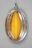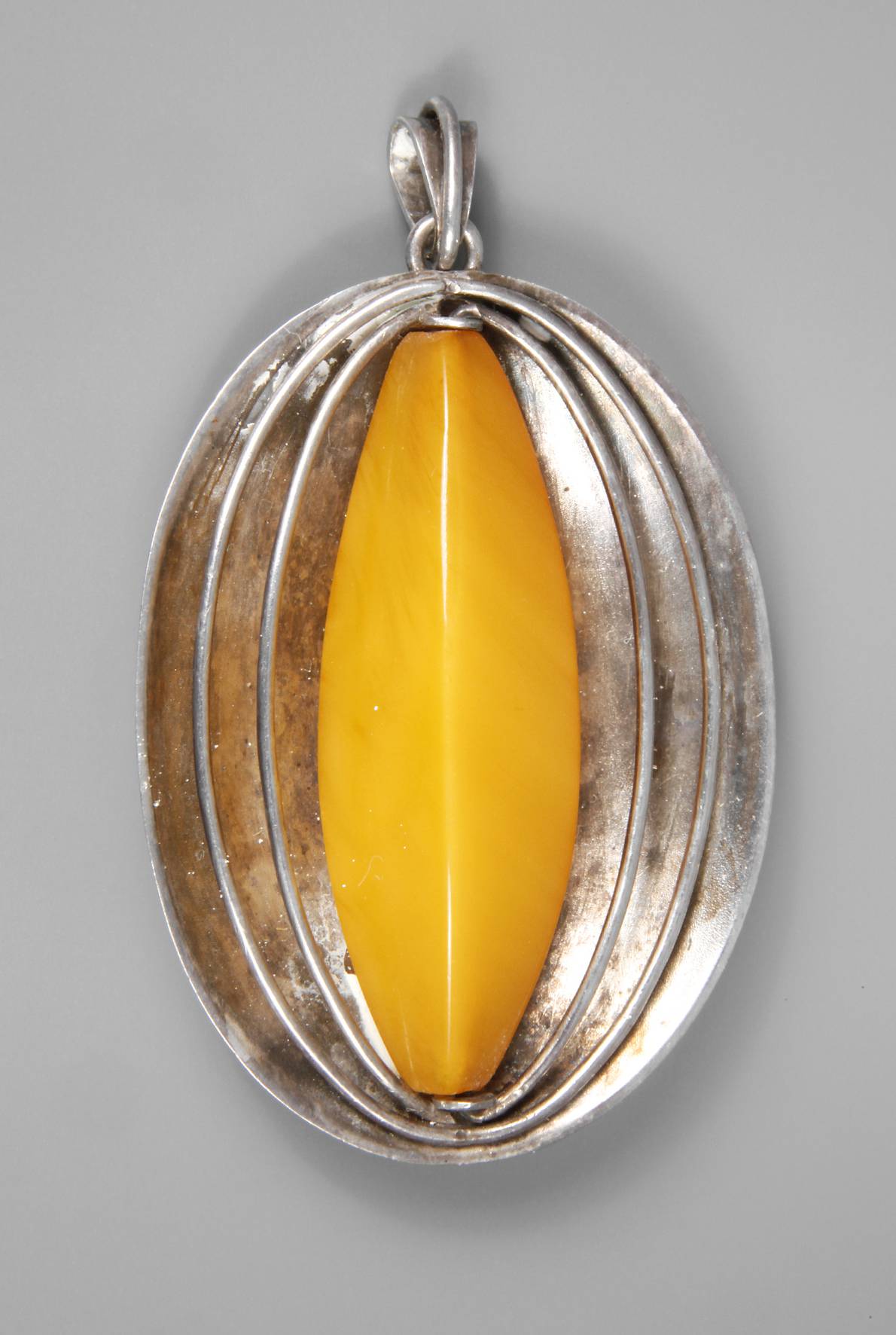 um 1970, Silber gestempelt 935 und Punze HH, ovale, konkav gebogene Form, mittig besetzt mit Bernsteinimitat, leichte Altersspuren, Maße ca. 57 x 35 mm, G ca. 12 g.