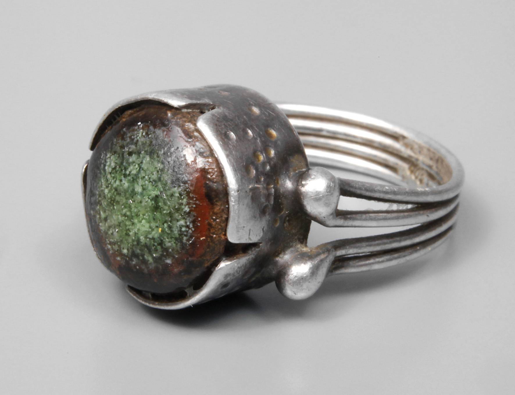 Mitte 20. Jh., Silber gestempelt 800 und RF, ca. 13 mm hoher Ringkopf, besetzt mit Glascabochon, leichte Tragespuren, RW 17,5 mm, G ca. 5,8 g.