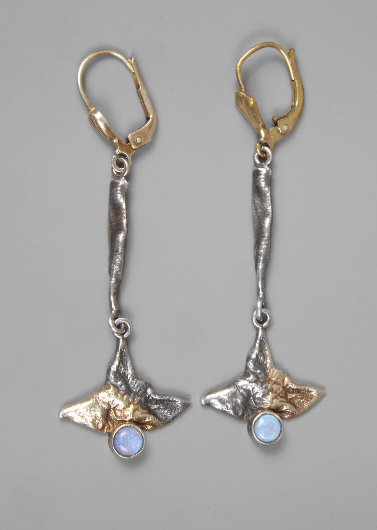 um 1970, Silber gestempelt 925, Bügel aus Messing, organische Form, jeweils besetzt mit einem Edelopalcabochon in Zargenfassung, Oberfläche teils patiniert und vergoldet, L ca. 54 mm, G zusammen ca. 4,4 g.
