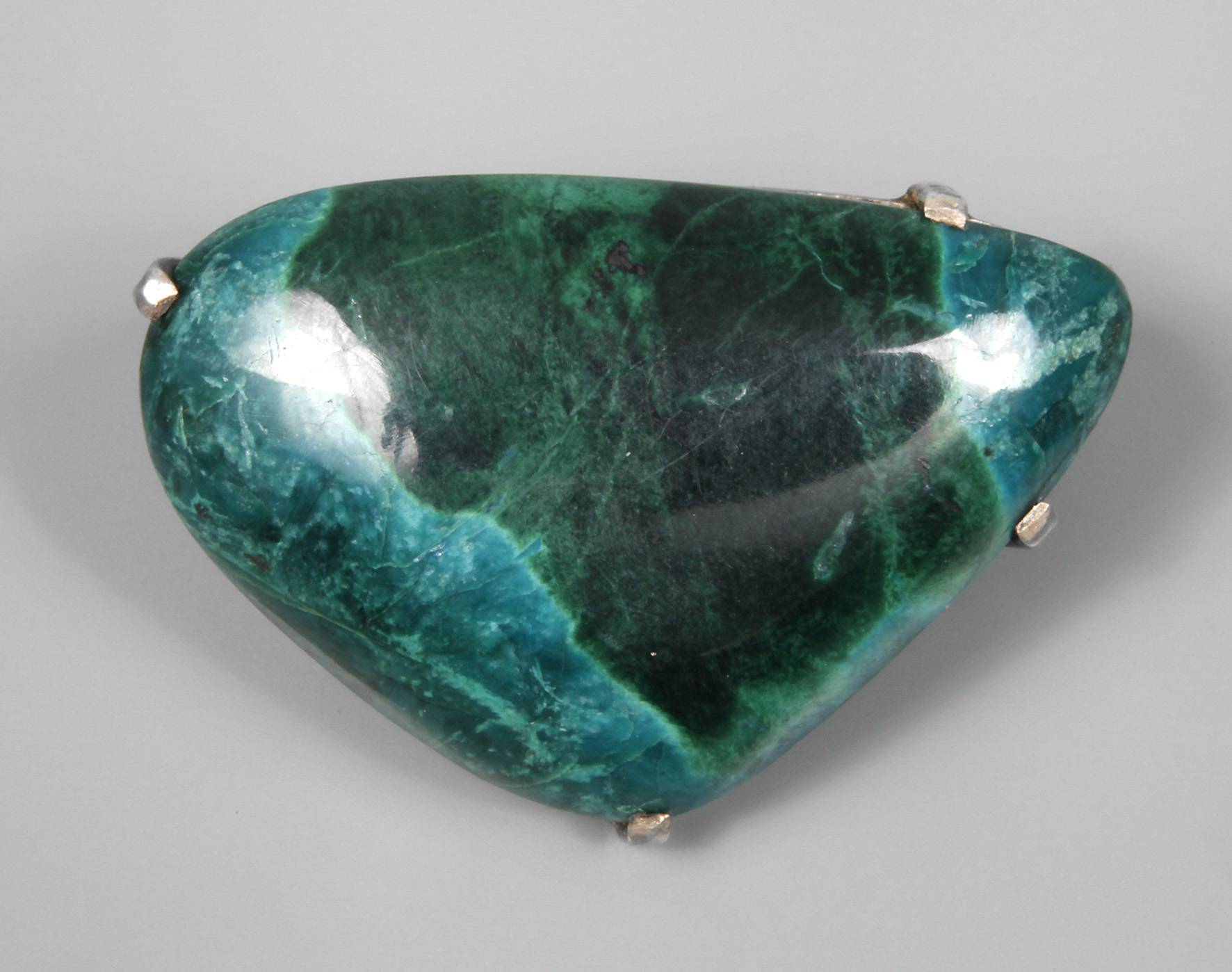 um 1970, Silber geprüft, besetzt mit unregelmäßig geschliffenem Chrysokoll in typischer Farbigkeit, auch als Anhänger zu tragen, Maße ca. 23 x 34 mm, G ca. 11,8 g.