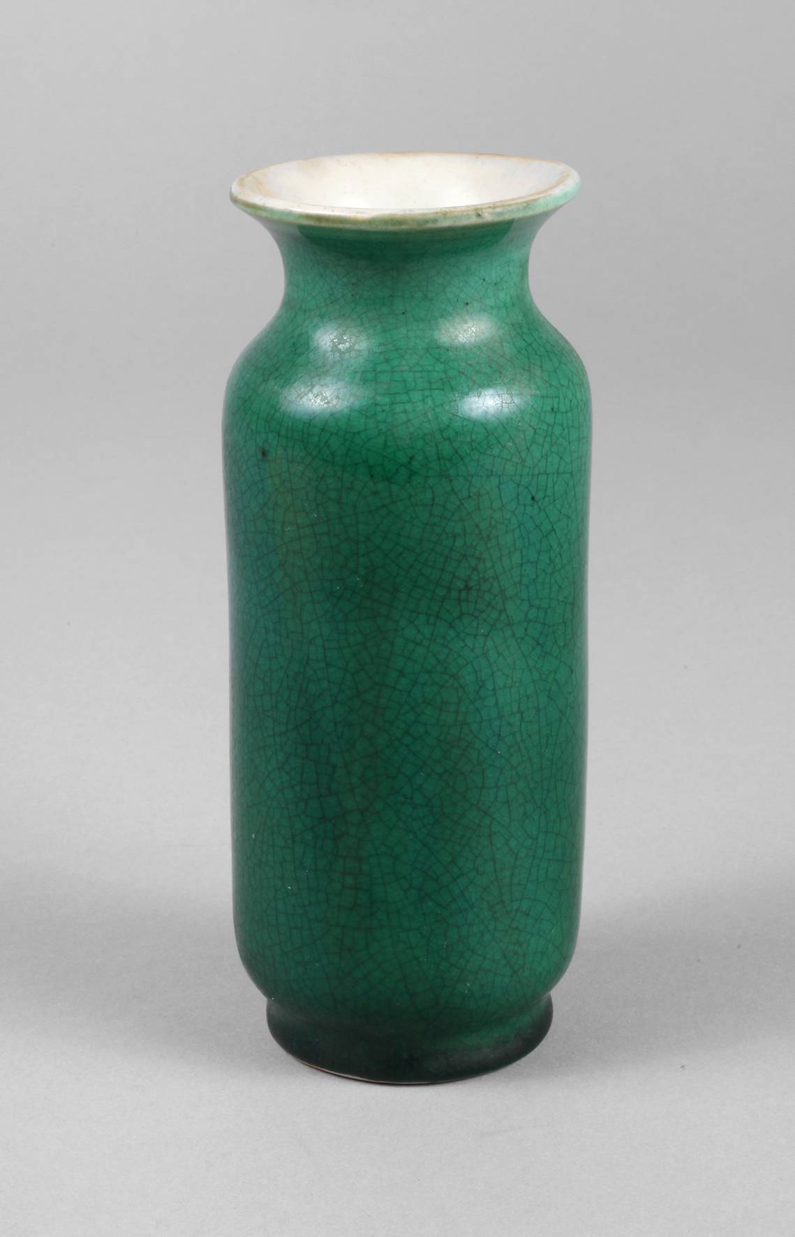 China, Ende 19. Jh., am Boden gepinselte Sechs-Zeichen-Guangxu-Marke (1875–1908), Weißporzellan mit smaragdgrüner Craqueléglasur, hoher, nur sanft gebauchter Korpus mit kurzem Hals und leicht ausschwingender Mündung, H 13,5 cm.
