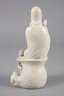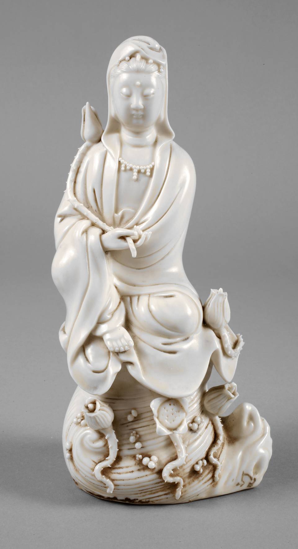 Ende 19. Jh., rückseitig mit undeutlicher Vier-Zeichen-Prägemarke, Dehua-Porzellan, auf einem stilisierten Wellensockel ruhende Guanyin mit Blütenzweigen in Kontemplation, min. Altersspuren, H 20 cm.