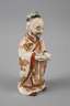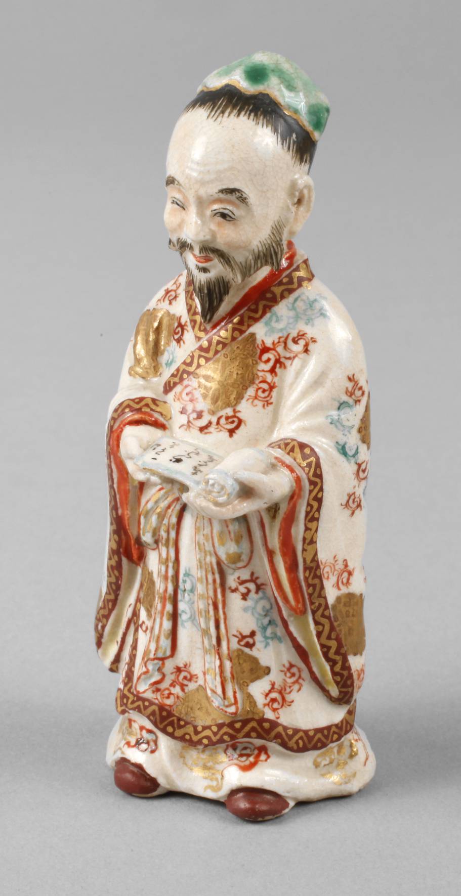 um 1900, an der Unterseite signiert, cremefarben glasiert und polychrom bemalt bzw. vergoldet, stehender Gelehrter im langen Gewand, in den Händen eine Schriftrolle haltend, etwas bestoßen, H 8,5 cm.