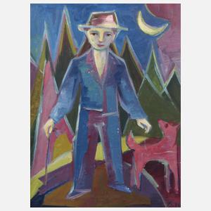 dem Betrachter zugewandter junger Mann, mit Hund und Stock, vor nächtlicher Landschaft mit Mondsichel, expressive, pastose Malerei in ausgewogener Farbigkeit, Öl auf Pressspannplatte, um 1930, rechts unten Monogramm „H.W.“, rückseitig in Blei bezeichnet „Hanns Weidner“ und betitelt „Junger Hirte“, auf Rahmen Klebeetikett „Kunsthandlung K. Ferd. Heckel Mannheim“, partielle Farbverluste, restaurierungsbedürftig, gerahmt, Falzmaß ca. 51 x 39,5 cm. Künstlerinfo: dt. Maler und Graphiker (1906 Augsburg bis 1981 Augsburg), 1925–28 Besuch der Kunstschule in Augsburg bei Professor Fritz Döllgast und Karl Rupflin, 1929–34 Studium an der Akademie der Bildenden Künste in München und hier Meisterschüler von Professor Julius Diez, ab 1934 als freischaffender Künstler tätig und von 1958–71 Dozent an der Werkkunstschule Augsburg. Quelle: Vollmer und Internet.