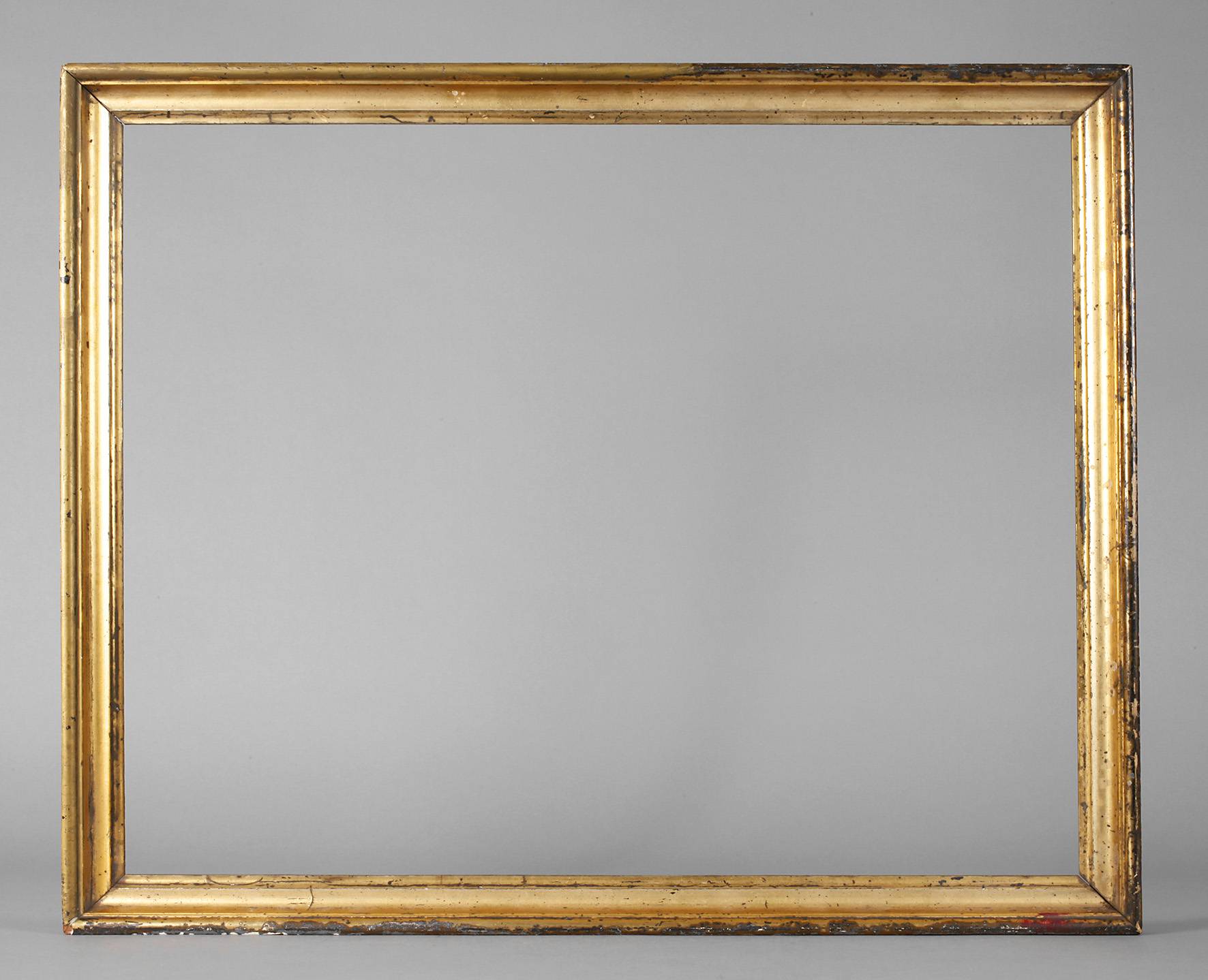 um 1860, ca. 3,5 cm breite, profilierte, versilberte und getönte Holzleiste, Gehrungen geschnitten, Altersspuren und partiell übergangen, Falzmaß ca. 60 x 49 cm.