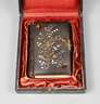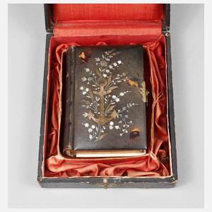Wonne in Gott, vollständiges Andachtsbuch des guten Christen ..., 4. Auflage, Verlag A. Laumann, Dülmen bei Münster i. W. 1892, Format 12°, XVI und 528 S., mit Frontispiz in Stahlstich, Goldschnitt und Moirepapier-Vorsatz, in orig. Halbledereinband mit Schildpattdeckeln, vorderseitig floraler Tauschierung in Silber, Kupfer, Perlmutt etc., Messingschließe intakt, in orig. Holzschatulle mit Seidenfutter, Exemplar mit minimalen Altersspuren, beschnittenem Titelblatt, reinigungsbedürftigen Deckeln und beriebener Schatulle.