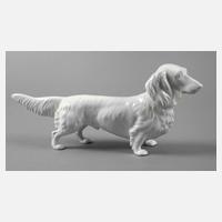 Entwurf Edmund Wagner 1929, Kunstabteilungsmarke Darmstadt, Steingut farblos glasiert, stehender Dackel in naturalistischer Ausformung, minimal brandfleckig, sonst guter Zustand, L 39 cm. Quelle: Rolf Peters, Max Roesler, Museum Künstlerkolonie Darmstadt und Porzellanmuseum Hohenberg, dort Kurzhaardackel abgebildet auf S. 119, Langhaardackel im Anhang S. 212 erwähnt.