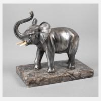 um 1900, unsigniert, Metallguss patiniert, die Stoßzähne aus Bein?, Elefant in naturalistischer Ausformung mit erhobenem Rüssel, auf rechteckigem Marmorsockel, gute Erhaltung mit kleinen Altersspuren , H 17 cm, L 18 cm.