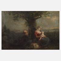 Maria mit dem säugenden Jesuskind, an einen mächtigen Baum gelehnt, Joseph hat ihr den Rücken zugewandt und lehnt ebenfalls am Stamm, Darstellung der neutestamentarischen Szene, in einer abendlichen Landschaft mit See am Horizont und von den letzten Strahlen der untergehenden Sonne erleuchteter Wolken, teils lasierende Malerei, Öl auf Leinwand, 2. Hälfte 18. Jh., unsigniert, Erhaltungsmängel, restaurierungsbedürftig, gerahmt, Falzmaß ca. 31 x 43 cm.