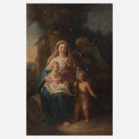 in einem Ruinenpasticcio sitzt Maria, vom Licht erhellt, mit dem Jesusknaben, welcher sich dem kindlichen Johannes (der Täufer) zuwendet, im Schatten dahinter beobachtet Joseph die Szene, feine Malerei, Öl auf Papier, dieses auf Leinwand, wohl 19. Jh., unsigniert, Erhaltungsmängel, restaurierungsbedürftig, in Goldstuckrahmen um 1800 gerahmt, dieser leicht wurmstichig und restaurierungsbedürftig, Falzmaß ca. 30 x 22 cm.