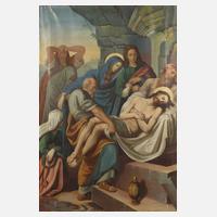 der leblose Leib von Jesu wird von Josef von Arimathäa und Nikodemus in das Felsgrab gelegt, im Hintergrund folgen die trauernde Maria und weitere Personen der Beisetzung, im linken oberen Bereich ist die Kreuzigungsstätte zu erkennen und die weibliche Gestalt im vorderen linken Bereich verweist mit der in ihren Händen gehaltenen Dornenkrone auf dessen Verspottung, altmeisterliche Malerei mit leicht pastosem Farbauftrag, Öl auf Leinwand, 19. Jh., leichte Erhaltungsmängel, restaurierungsbedürftig, ungerahmt, Maße ca. 78 x 54 cm.