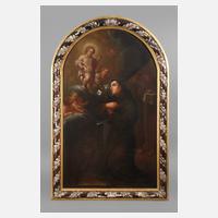 Darstellung der Vision des heiligen Antonius von Padua (1195–1231), er galt als wortgewandter, wie überzeugender Redner, mit dessen enormer Bibelvertrautheit und Glaubwürdigkeit bekehrte er zahlreiche Atheisten zum christlichen Glauben, was ihm den Beinamen ”Hammer der Ketzer” eintrug, als Ordensprovinzial der Romagna in Padua gelang es ihm, eine große Anhängerschar hinter sich zu versammeln und das Christentum, wie auch die Romagna erreichten eine erste Blütezeit, der Franziskanermönch wurde auf Grund der zahlreichen ihm zugeschriebenen Wunder bereits 11 Monate nach seinem Tod von Papst Gregor IX. heiliggesprochen, er wird als Patron von Padua, Lissabon, Hildesheim und Paderborn verehrt, wird als Schutzheiliger in verschiedensten Lebenslagen angerufen und gilt als Patron der Armen, Liebenden, der Ehe, Bäcker, Bergleute, Schweinehirten, der Reisenden, Pferde und Esel, größter Popularität erfreut er sich als Heiliger für das Wiederauffinden verlorener Dinge, so avancierte Antonius schnell zu einem der bekanntesten und beliebtesten Schutzheiligen und erfährt in zahlreichen Kirchen breiteste Verehrung, die vorliegende Darstellung spielt auf die überlieferte Legende an, wonach Antonius bei seinem Förderer Graf Tiso von Camposampiero verweilte, als dieser Nachts den Mönch aufsuchen wollte, um ihn nach seinem Befinden zu befragen, drang aus der Kammer des Mönchs ein heller Lichtschein, ein Feuer vermutend öffnete der Graf die Tür und fand den lächelnden Antonius in trauter Zweisamkeit mit dem strahlenden Christuskind, wobei der Lilienzweig in der Hand des Mönchs seine Reinheit im Leben und Glauben versinnbildlicht, lasierende, religiöse Genremalerei im Hochformat, mit oberem Rundbogenabschluss, Öl auf Leinwand, 18. Jh., unsigniert, rückseitig auf der Rahmung und Keilrahmen teils unleserliche alte Jahreszahl ”17(6)8” oder ”1708”, Altersspuren, doubliert, restauriert, original im mit Akanthusranken verzierten, vergoldeten und versilberten Rahmen (Erhaltungsmängel) gerahmt, Falzmaß ca. 132 x 79 cm.