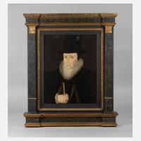 Brustbildnis eines würdevollen älteren, weißbärtigen Herrn mit hohem schwarzen Hut, an dem ein Schmuckstück mit Portraitmedaillon befestigt ist, weißer Halskrause in Gestalt eines Mühlsteinkragens und schwarzem Mantel mit roten Innenfutter, vor dunklem Grund, bei dem Dargestellten William Cecil (1521–1598) handelt es sich um einen der bedeutendsten britischen Staatsmänner des elisabethanischen Zeitalters, er wurde als einziger Sohn des Richard Cecil Lord of the Manor von Burghley in Bourne/Lincolnshire geboren, studierte 1535–40 Rechtswissenschaft in Cambridge, anschließend tätig für die Honourable Society of Gray’s Inn (Anwaltskammer) in London, avancierte zum persönlichen Sekretär von Edward Seymour, 1. Duke of Somerset, einem Bruder der künftigen Königin Jane Seymour, später diente er sich als erster Staatssekretär in der Regierung von John Dudley, 1. Duke of Northumberland an und wurde dessen engster Vertrauter, Dudley betraute Cecil mit der Verwaltung der Grundstücke der Prinzessin Elisabeth, 1550 zum Ritter geschlagen, erlangte er durch fortwährenden Wechsel der politischen wie religiösen Lager, Verrat und Intrige eine stetig wachsende Machtfülle, zeitweilig diente der zum Katholizismus konvertierte Protestant als Diplomat der katholischen Königin Maria I., um später erneut zum Protestantismus zu wechseln und ab 1558 im Dienste der protestantischen Königin Elisabeth I. von England zu stehen, für Elisabeth I. wurde Cecil der engste Berater und Vertraute und sie bezeichnete ihn als ”ihren Intellekt”, sie erhob ihn 1571 zum Baron Burghley, übertrug ihm 1572 das Amt des Lord High Treasurer (Lordschatzmeister) und ernannte ihn zum Vorsteher des Court of Wards (Vermögensverwalter königlicher und hochadliger Mündel), beide Ämter, die ihm zu eigenen Gunsten den Zugriff auf erhebliche Vermögen ermöglichten, verbunden mit geschickten Spekulationen, ließen ihn zu unermesslichem Reichtum kommen und ermöglichten ihm, schuldenfrei seine privaten Schlossbauprojekte umzusetzen, unter Elisabeth I. unterstützte er maßgeblich deren Bemühungen um eine Neuordnung der Anglikanischen Kirche, bekämpfte fortan den Katholizismus als politische Gefahr und war maßgeblicher Befürworter der Hinrichtung Maria Stuarts, Cecil hält auf vorliegendem Gemälde einen weißen Stock als Zeichen seiner Amtsgewalt in der rechten Hand, dem lateinischen Schriftzug am oberen Bildrand ”ÆTA SVÆ 76 – 1597 (dt.: Im Alter von 76 (Jahren) – 1597)” ist zu entnehmen, dass das Bildnis den greisen Baron im letzten Lebensjahr zeigt, dünn lasierende Malerei über hell grundiertem Malgrund und partiell durchscheinender Vorzeichnung, Öl auf alter, partiell mit Leinen hinterklebter Holzplatte, unsigniert, von oben mittig senkrechter Spannungsriss in der Holzplatte, etwas alt restauriert, stellenweise Schollenbildung und zeltförmige Ablösung der Malschicht, partiell Malschichtverlust, restaurierungsbedürftig, sehr schön im Tabernakelrahmen um 1900 (mit Altersspuren) nach Renaissancevorbild gerahmt, Falzmaß ca. 57,5 x 44 cm.