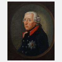 Brustbildnis des auch ”Alter Fritz” genannten Königs von Preußen und Kurfürsts von Brandenburg Friedrich II. (1712–1786) im Halbprofil nach rechts, mit Bruststern des Schwarzen Adlerordens, nach einem Stich des Mannheimer Kupferstechers Aegid Verhelst dem Jüngeren (wohl 1733–1804) aus dem Jahr 1794, welcher sich wiederum an dem bekannten Gemälde von Anton Graff aus dem Jahre 1781 orientierte, fein lasierende klassizistische Portraitmalerei, Öl auf Leinwand, um 1800, unsigniert, doubliert, Craquelure, restauriert, alt gerahmt, Falzmaß ca. 35 x 28,5 cm.