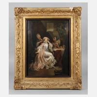 Blick in dämmrige, morbide Spelunke, mit alter Frau am Tisch, einer sitzenden vornehmen Dame mit Zofe aus Karten und Kaffeesatz die Zukunft deutend, qualitätvolle, fein lasierende, historisierende Genremalerei, Öl auf alter, aus zwei Brettern zusammengefügter Holzplatte, wohl 19. Jh., links unten undeutlich monogrammiert ”M.G.”, rückseitig Fragment eines roten Lacksiegels, geringe Craquelure, Malgrund leicht gewölbt und etwas holzwurmstichig, restauriert, minimal restaurierungsbedürftig, sehr schön original im ca. 10 cm breiten, über Eck gearbeiteten Goldstuckrahmen um 1860 gerahmt (bestoßen), Falzmaß ca. 51,5 x 42 cm.