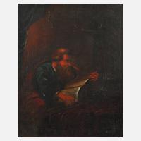 Bildnis eines bärtigen Mannes, im blauen Wams mit rotem Umhang, im dämmrigen Interieur ein Buch studierend, lasierende Genremalerei, Öl auf Leinwand, unsigniert, Craquelure, doubliert und restauriert, gerahmt, Falzmaß ca. 41 x 33,5 cm.