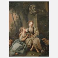 verwunschene parkähnliche Landschaft, mit zwei jungen Frauen vor einem Denkmal mit ruhenden Löwen, beim Befestigen eines Briefes an einer Brieftaube, mit zwei Schafen an ihrer Seite, leicht pastose Malerei, Öl auf Leinwand, 2. Hälfte 18. Jh., unsigniert, doubliert, restauriert, Fehlstellen in der Malschicht, gerahmt, Falzmaß ca. 57,5 x 44,5 cm.