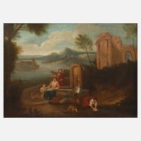 Gesellschaft vor weiter komponierter, mediterraner Sommerlandschaft mit antiker Ruine, lasierende Malerei, Öl auf Leinwand, 18. Jh., unsigniert, doubliert, minimal restaurierungsbedürftig, in alter barocker Leiste (holzwurmstichig) gerahmt, Falzmaß ca. 33,5 x 45,5 cm.