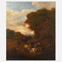 Blick in abendliche mediterrane Landschaft, am Fuße eines Postaments mit Darstellung der Allegorie des Nils (in Gestalt eines bärtigen, auf einer Sphinx lagernden Männerakts mit Füllhorn), hat sich ein Hirte mit seiner Herde aus Schafen und Ziegen neben seinem Maulesel zur Rast niedergelassen, Tier und Mensch scheinen mit der Landschaft zu verschmelzen, wären da nicht einige effektvolle Lichter aus imaginärer Quelle, welche die Tiere der Dunkelheit entreißen, im Gegensatz zu der Dämmerung und mithin dem Schlaf anheimfallenden Landschaft, scheint der blaue Himmel, mit seinen dramatisch erleuchteten Wolken, von dynamischer Ruhelosigkeit zu künden, die Malerei zeigt starke Bezüge zum Werk von Nicolaes Pieterszoon Berchem, welcher van de Velde künstlerisch stark beeinflusste, obgleich nicht gesichert ist, dass Berchem in Italien weilte, schuf er mediterrane Landschaften mit Tierstaffage und antiker Ruinenarchitektur, van de Velde hat in seinen gesicherten Werken, wie sein Vorbild, obgleich er definitiv nie in Italien weilte, neben der typischen Landschaft, vielfach auch römische Artefakte als Zitat im Bild verwendet, im vorliegenden Gemälde lässt der Künstler den Hirten samt Herde zu Füßen der Allegorie des Nils rasten, die zwar per se nicht in eine italienische Landschaft gehört, deren Original (eine römische Arbeit aus dem 1. Jahrhundert nach Christi) jedoch in den vatikanischen Museen verwahrt wird und somit einen Bezug zu Rom herstellt, auch die Behandlung des Lichts, die Komposition der Landschaft und die stark kontrastierende Wiedergabe von Himmel und Landschaft, finden sich neben der Tierdarstellung im Werk Adriaen van de Veldes, lasierende, teils minimal pastose Malerei, Öl auf Leinwand, 2. Hälfte 17. Jh., unsigniert, doubliert, alt restauriert, minimale Craquelure, etwas restaurierungsbedürftig, sehr schön in ca. 10 cm breiter dunkler Wellenleiste mit vergoldeter Innenkante gerahmt (rückseitig Düsseldorfer Rahmungsetikett um 1910), hier auch altes Messingrahmenschild mit fehlerhafter Zuschreibung ”Adrian van de Velde 1639–1772”, Falzmaß ca. 58 x 50 cm. Künstlerinfo: niederländischer Maler und Radierer (1636 Amsterdam bis 1672 Amsterdam), entstammt bedeutender holländischer Malerfamilie, zunächst Schüler seines Vaters, des Zeichners Willem van de Velde (ca. 1611–1693), später Schüler von Jan Wijnants (auch Jean Wynants, ca. 1632–1684) und Paulus Potter (1625–1654) in Haarlem, beeinflusst von Philips Wouwerman (1619–1668) und Nicolaes Pieterszoon Berchem (1620–1683), anschließend Rückkehr nach Amsterdam und zunächst Mitarbeit im Atelier von Karel Dujardin (1622–1678), danach freischaffend, teilweise als Staffagemaler (Tiere und Menschen) für Jan Hackaert, Jacob Isaackszoon van Ruisdael, Meindert Hobbema, David de Koninck, Jan van der Hagen, Adrien Verboom, Guilam Dubois, Jan Hackaert, Frederik de Moucheron, Jan Wijnant und Jan van der Heyden tätig, Quelle: Thieme-Becker, Wikipedia und Allgemeine Deutsche Biographie.
