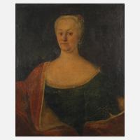 Brustbildnis einer herrschaftlichen, mit diversen Schmuckstücken dekorierten Dame, mit gepuderter Perücke, im blauen, mit Spitze besetzten Kleid und rotem Umhang, vor dunklen Grund, die Dargestellte war Ehefrau des Freiherrn Daniel Raban von Stein aus dem thüringisch-hessischen Adelsgeschlecht derer von Stein-Liebenstein zu Barchfeld und residierte mit ihrem Ehemann auf Schloss Barchfeld im Wartburgkreis, Öl auf Leinwand, links unten signiert und datiert ”T. J. Hellmund Ao. 1738”, rückseitig auf der Leinwand bezeichnet ”J. D. (Dorothea) Sophia von Stein geboren von Webern”, Craquelure, alt hinterlegte Fehlstellen in der Leinwand, Altersspuren, etwas restaurierungsbedürftig, in schlichter, alter, ebonisierter Leiste gerahmt, Falzmaß ca. 82,5 x 70 cm.
