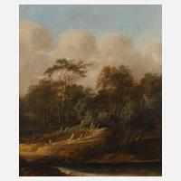 geborstene Baumstämme und vom Wind gebeugte Laubbäume, am Ufer eines Flusses, lasierende, wohl holländische Landschaftsmalerei mit wenigen pastosen Effekten, Öl auf alter Holzplatte, wohl Ende 17. Jh., unsigniert, rückseitig fragmentarisches Etikett mit Restaurierungsvermerk von 1967, mittig horizontale Ansatzstelle zweier alt zum Malgrund gefügter Bretter geklebt und anlässlich der Restaurierung mit Schwalbenschwanzriegeln gesichert, Malerei restauriert, im Goldstuckrahmen gerahmt, Falzmaß 41 x 36 cm.