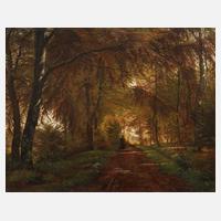 herbstlich gefärbter Laubwald mit einzelnen, den Waldboden erleuchtenden Sonnenfetzen, durchbrochen wird das Motiv von einem breiten Waldweg, auf dem eine einsame Pilzsammlerin dem Betrachter entgegen schreitet, einfühlsame, detailreiche Malerei in warmer, erdiger Farbigkeit, Öl auf Leinwand, rechts unten signiert und datiert „JBoesen 1871“, gerahmt, Falzmaß, 48,5 x 59,5 cm. Künstlerinfo: dän. Maler (1847 Kopenhagen bis 1916 Hellerup), 1863–71 Studium an der Kunstakademie in Kopenhagen sowie bei Emmerik Lucian Höegh-Guldberg und Peter Christian Thamsen Skovgaard, 1879–80 Reise nach Italien und Frankreich sowie 1886 nach Deutschland und Belgien, erhielt 1894 die Jahresmedaille auf der Kunstausstellung in Kopenhagen, Quelle: Thieme-Becker, Weilbach und Bénézit.