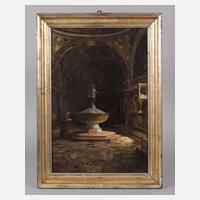 Blick ins Baptisterium mit dem Taufbecken von Jacopo Sansovino (1546) im Zentrum, vor dem ein Priester auf und ab geht und in einem Buch liest, die geheimnisvoll beleuchtete Szene lässt die Mosaikkunst der Wände im byzantinischen Stil des 14. Jh. nur erahnen, ein schwacher Lichtschein fällt auf das Grab des Dogen Andrea Dandolo, feine, detailreiche Architekturmalerei, Öl auf Leinwand, 19. Jh., rechts unten signiert ”Leo v. Böhm”, rückseitig bezeichnet ”Markuskirche Venedig, Taufkapelle”, Craquelure, geringe Farbverluste, kleine geschlossene Fehlstelle in der Leinwand, etwas restauriert, in Berliner Leiste gerahmt, Falzmaß ca. 55 x 37,5 cm.