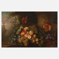 nach einem Gemälde von Jacob Bogdany (1658 bis1724), auf einem barocken Piedestal, neben einer steinernen Ziervase, liegen die Früchte des Herbstes, von bunten Weinranken umhüllt, links öffnet sich der Blick auf eine Art Schlosspark, feine Malerei in altmeisterlicher Manier, Öl auf Leinwand, Ende 19. Jh., unten rechts signiert ”Dienes Laszlo” und bezeichnet ”Bogdany...”, restauriert, Leinwand hinterlegt, gering restaurierungsbedürftig, ungerahmt, Maße ca. 63,5 x 95,5 cm.