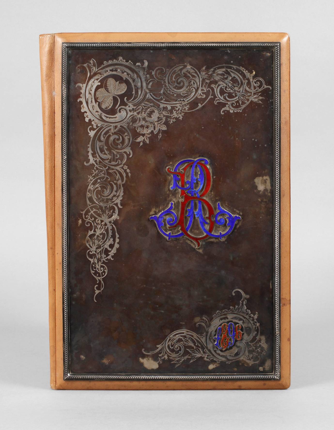 Sankt Petersburg 1896, gepunzte Meistermarke und unbekannte Beschaumeistermarke St. Petersburg, Silberstempel 84 Zolotniki, braune Dokumentenmappe aus lederbezogenen Holzplatten, innen Facheinteilung aus hellbrauner Seide, fein gravierter Silberbeschlag mit Rollwerk und Blüten, appliziertes Besitzermonogramm AB und Jahreszahl 1896, blau und rot transluzid auf Guillochégrund emailliert, rückseitig Silberfüße ebenfalls gestempelt, Seide wasserfleckig, sonst normale Gebrauchs- und Altersspuren, 40 x 28 cm.