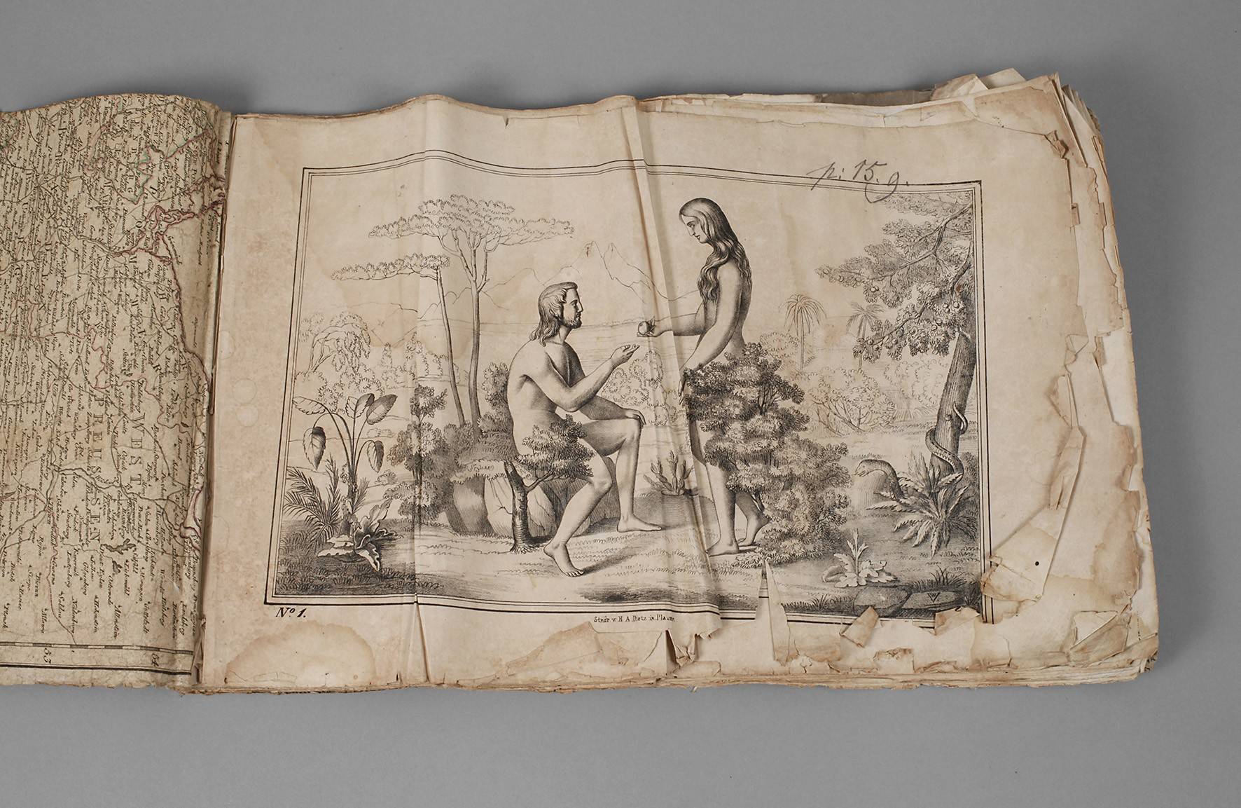 Szenen aus dem Alten Testament, Steindruck von H. A. Dietz, Plauen um 1848, Querformat Lex. 8°, ohne Titelblatt, mit 40 nummerierten, kreidelithogr. Tafeln, jeweils mit Künstlermonogramm WV und Kapitelangabe, letztes Blatt datiert, Vorsatzpapier mit Deutschlandkarte der Zeit doubliert, ohne Einband, vollständiges, fleckiges Exemplar mit diversen Knickspuren und partiellen Randläsuren, diese bei der ersten Tafel die Abb. tangierend.