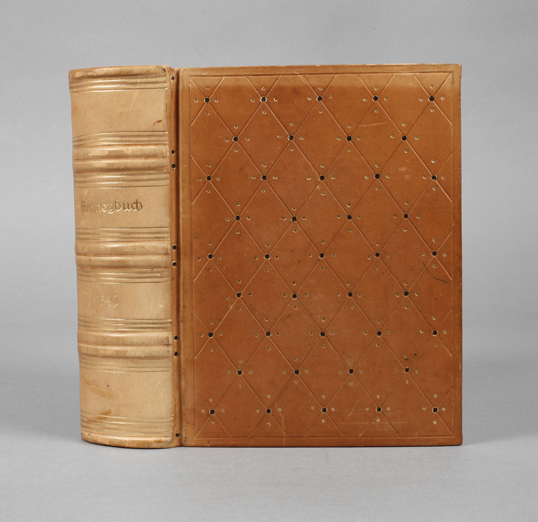 Artzneybuch, köstlich für mancherley Kranckheit des gantzen Leibs, Jnnerlich vnd eusserlich vom Heupt an bis auff die Füsse, von vielen Hochberümpten und erfarnen Artzten mit sonderm vleis ordentlich beschrieben ... Jtzo newe in Druck und an tag gegeben, (Hrsg. von Tarquinius Ocyorus alias Schnellenberg), Druck Melchior Sachse, Erfurt 1546, angebunden Der veldtbaw, od[er] das buch von der veld arbeyt, in dem alle notwendige stuck, so zur veldarbeyt dienstlich oder hinderlich sein mögen, mit höchstem fleiß angezeygt werden ... und yetz newlich durch D. Michael Herren, auß der Kriechischen, in Teütsche sprach vertolmetscht : Der verldtbaw oder das buch von der veldarbeyt ... yetz newlich durch Michael Herren ... vertolmetscht, gedruckt zu Balthasar Beck, Straßburg 1545, Format 8°, 6 Blätter, CCLXVI S. sowie 24 Blätter und 148 nummerierte Blätter, mit einigen pflanzlichen und figuralen Holzschnitten, in neuzeitlichem Ledereinband mit dekorativer Goldprägung, restauriertes, minimal fleckiges Exemplar mit den ersten 22 in Kopie beigefügten Blättern und ca. zehn Blättern mit Ergänzungen.