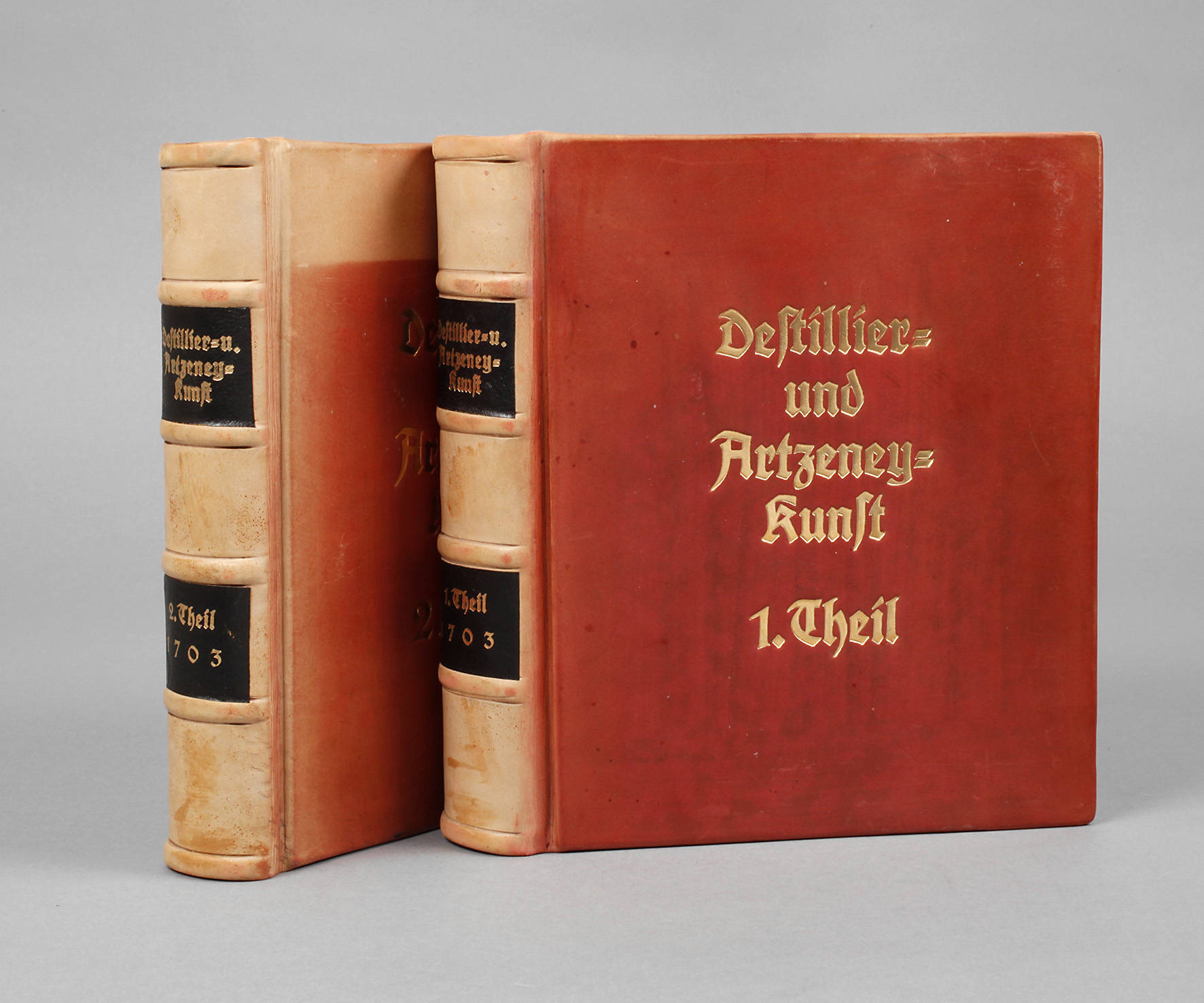 Medullae destillatoriae & medicae, das ist: der aus den Geheimnissen der Natur hervorgesuchten unschätzbaren höchstbewährten Destillier- und Artzeney-Kunst, erster Theil ... (und) ... ander Theil ... (in zwei Büchern), von Conrado Khuntath, vermehret von L.C.H.P.T., in Verlegung Joh. Herbord Klossens, Frankfurt/Leipzig 1703, Format 8°, 6 Blätter, 608 S. und 28 Blätter bzw. 4 Blätter, 552 S. und 25 Blätter, mit Frontispiz in Kupfer sowie wenigen Holzschnitt-Vignetten und Initialen, Schwarzschnitt, gleich gebunden in neuzeitlichen Ledereinbänden mit dekorativer Goldprägung, diese partiell verblichen, sonst dem Alter entsprechend sehr gut erhalten.