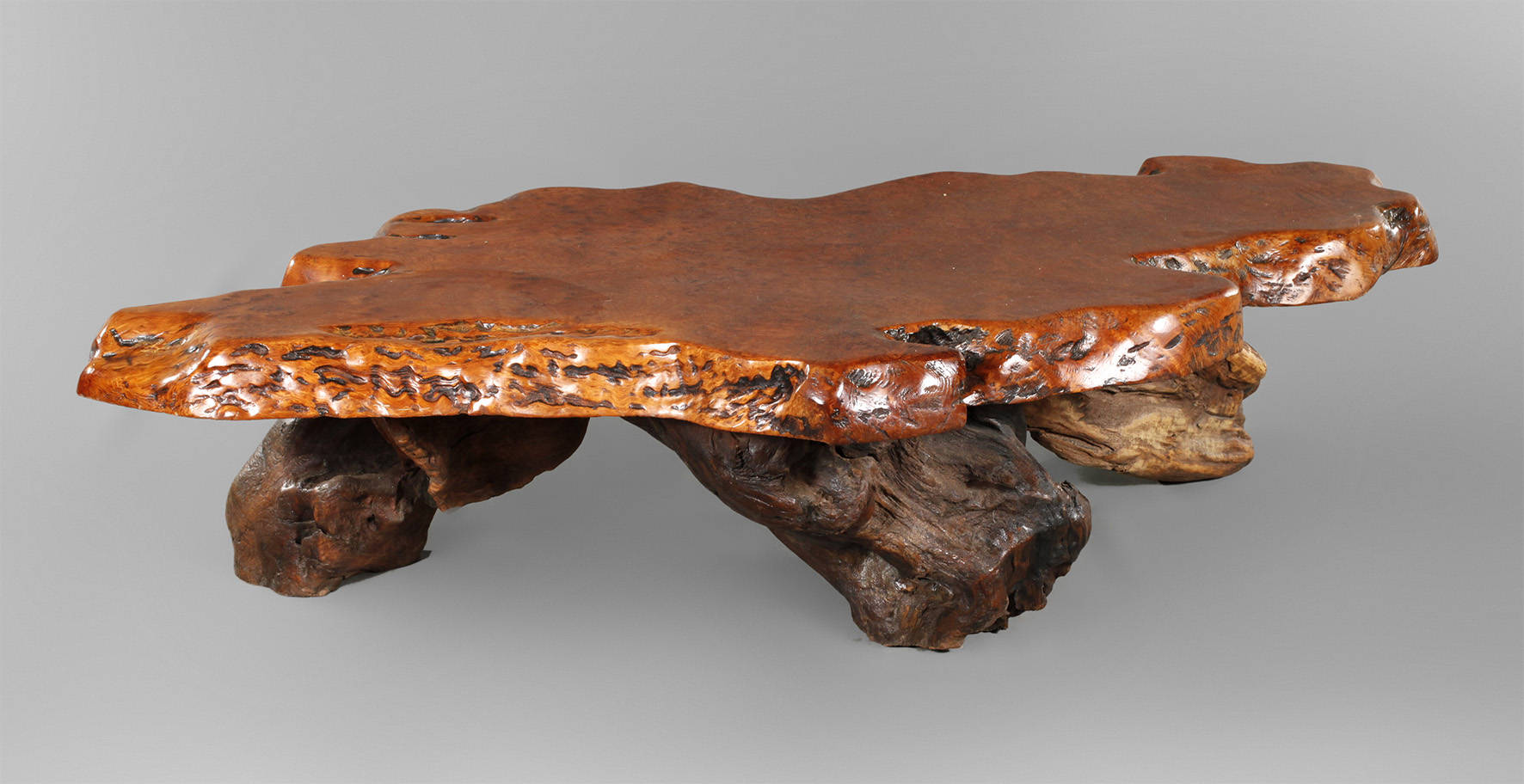 wohl Kanada, Mitte 20. Jh., aus einer massiven Baumscheibe gefertigt (wohl Redwood), die Beine aus Teilen der Wurzel, Oberfläche poliert, guter Zustand, H 47 x B 187 x T 90 cm.