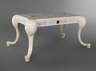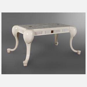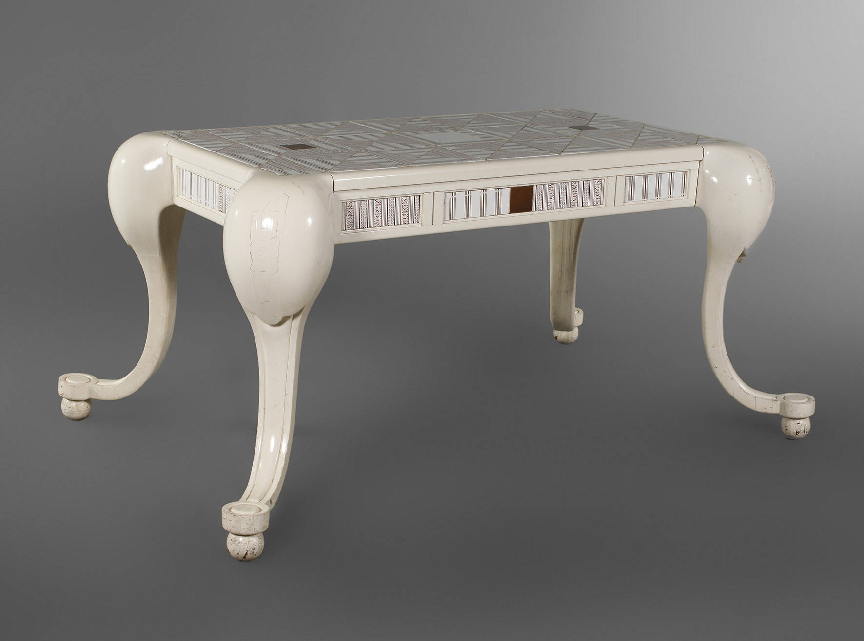 wohl Italien, 1970er Jahre, Hartholz cremefarben lackiert, Platte und Zarge mit geometrisch verzierten Fliesen belegt, zwei Fliesen an der Schublade fehlen, partiell Trocknungsrisse, H 72 x B 160 x T 100 cm.