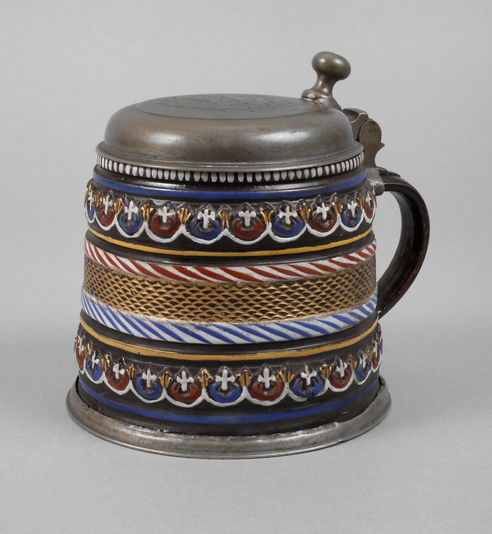 um 1680, gedrungener, leicht konischer Walzenkrug, bis 1991 Annaberg zugeordnet, schwarz/braune Engobe, vergoldetes Schuppenband mittig, eingefasst von rot und blau gestrichelten Wülsten und umlaufenden Blattfriesen in bunter Emailbemalung, die Gurtreifen fehlen, Zinnstandring, übergreifend sitzender Deckel mit kleiner, voller, nach hinten geneigter Kugelrast, auf dem Deckel Gravur im offenen Blätterkranz ”M.R.-M. 1682”, Deckelgelenk innen repariert, keine offensichtlichen Beschädigungen, ungepunzt, Lit.: Josev Horschik, S. 242, H ges. ca. 16 cm, H Gefäß ca. 12,7 cm.