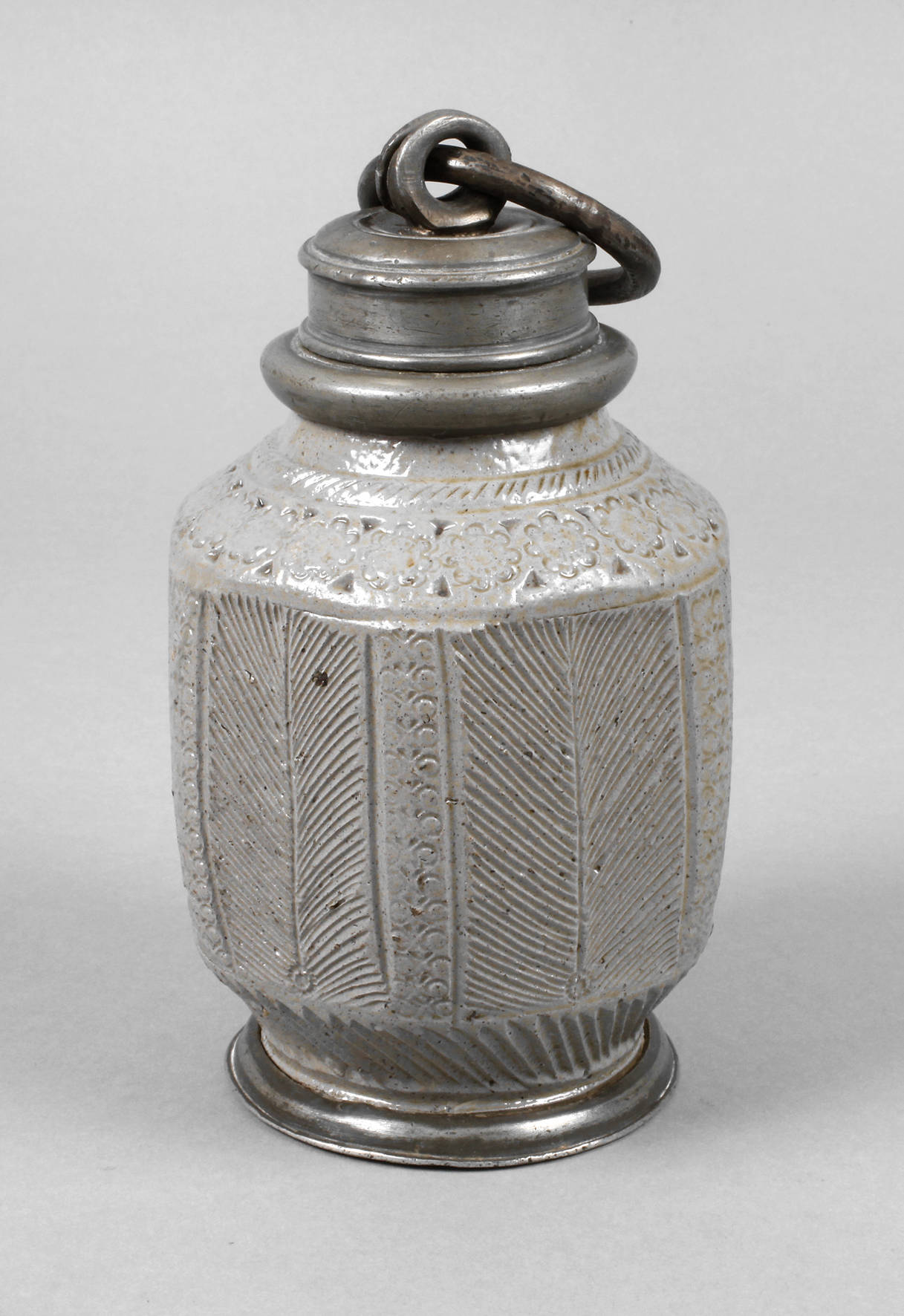 um 1670/90, graues Steinzeug, salzglasiert, die Wandung facettiert, geritzt und gestempelt, Zinnmontur bestehend aus Standring, Mündung und schraubbarem Deckel mit klappbarem Ösenhenkel, sehr guter unbeschädigter Originalzustand, H 19,5 cm.