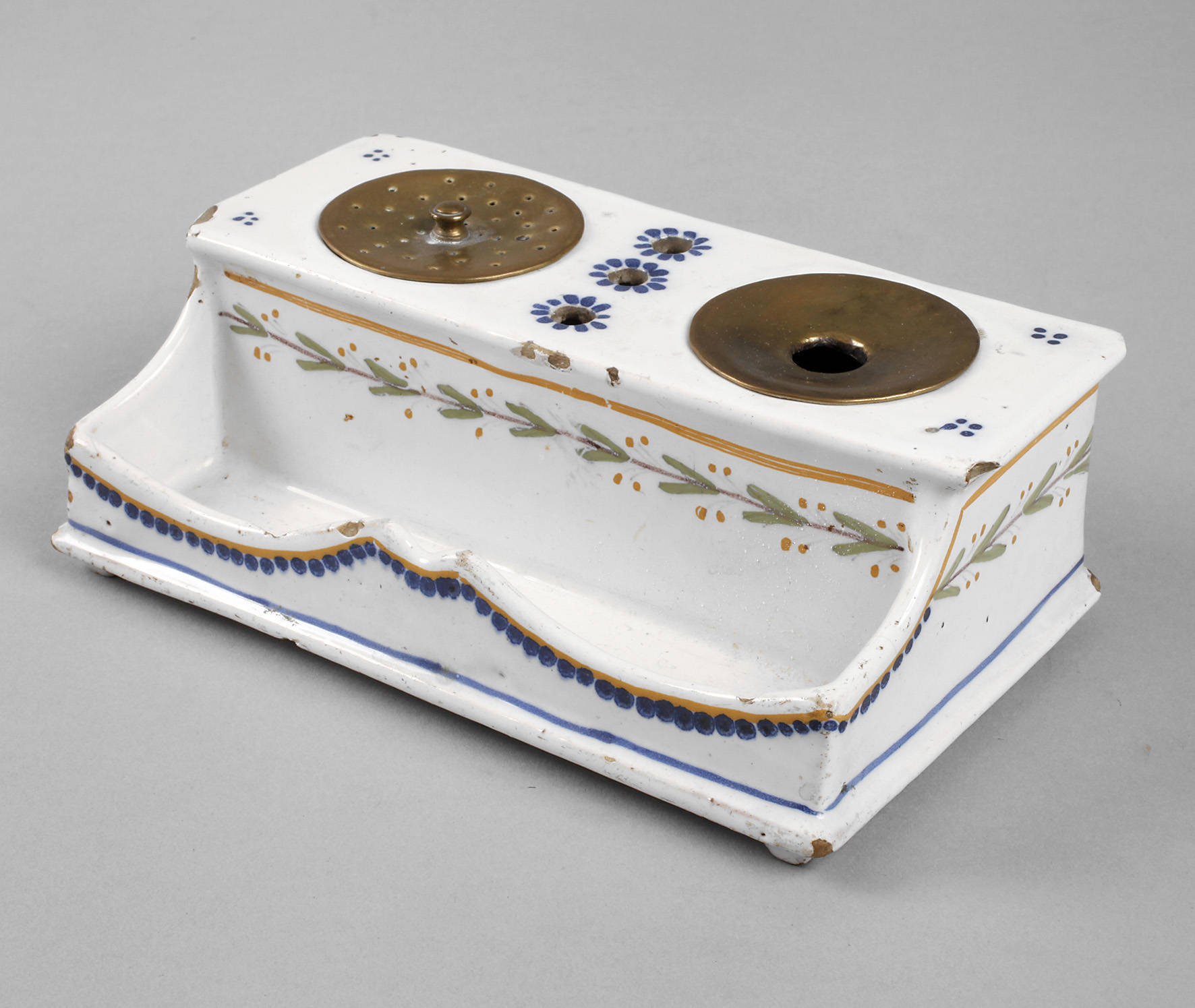 Kelsterbach oder Flörsheim, Ende 18. Jh., hellbrauner Fayencescherben, weißlich glasiert, mit Scharffeuerfarben in Kobaltblau, hellem Grün und Ockergelb bemalt, rechteckiges Gefäß mit Stiftablage, darin Tintenfass und Sandstreuer aus Messing, mittig drei Einsteckösen für Federn, an den Kanten mehrere Bestoßungen, L 16,5 cm.